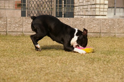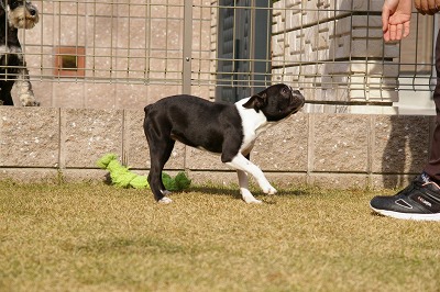 身体は小ぶりですが、成犬の他のボストンテリアに負けず社交的な子です。
