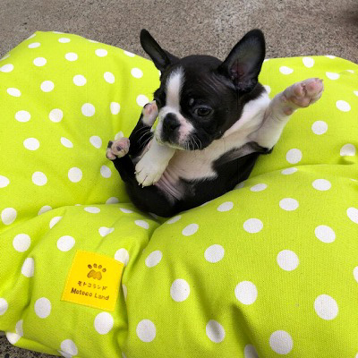 モトコランドオリジナルの「匂い付ぬいぐるみ」も大好きですが、同じくオリジナルの「モトコランドベッドクッション」もお気に入りです。気持ちよさそうに寝ることもありますが、元気にベッドの上で遊ぶこともあります。ベッドの上で寝転んでみると真ん中のへこみ(洗う時に中の綿が動かないようにするため)にすっぽりはまりしばらく起き上がれなくなるハプニングもありました(笑)。