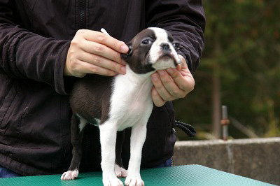 徳島県の友永様がご予約されているボストンテリアの女の子の満福ちゃん(ボストンカラー)です。お手入れの練習をしました。(爪切り,耳掃除)