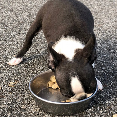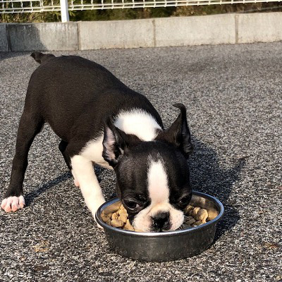徳島県の友永様がご予約されているボストンテリアの女の子の満福ちゃん(ボストンカラー)です。離乳食の様子です。