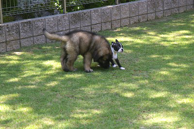 ボストンの子犬からもレオンベルガーの子犬からも気遣いのある仕草が表れているのが見て取れます。