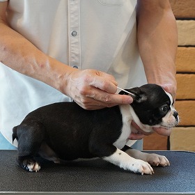 6/30生まれのボストンテリア3兄弟のパピー合宿の様子は、今回「お手入れ編」です。